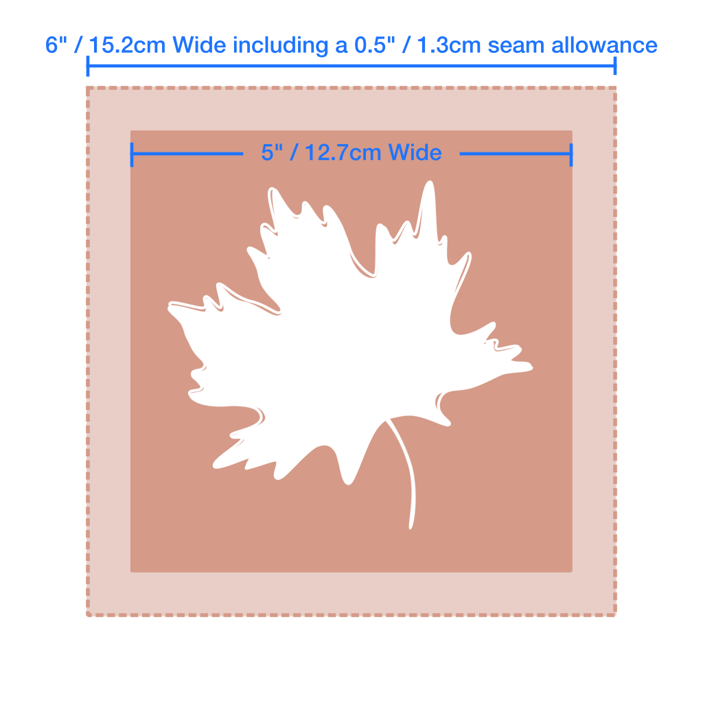 A basic square should be 6″ by 6″, with your design taking up the centre 5″, which provides a 0.5″ seam allowance.